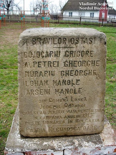 Pe monumentul de la Lunca, care a fost ridicat în anul 1914, este scris “BRAVILOR OSTAŞI COJOCARIU GRIGORE, APETREI GHEORGHE, MORARIU GHEORGHE, LHAN MANOLE, ARSENI MANOLE din comuna Lunca, Județul Dorohoi care și-au jertfit viața, pentru Țară în campania anului 1913 peste Dunăre în Bulgaria. PATRIA RECUNOSCATOARE”.