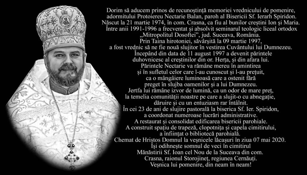 Luni, 15 iunie 2020, la Biserica Sfântul Spiridon din Herța a fost oficiat parastasul rânduit la şase săptămâni de la trecerea la Domnul a fostului părinte slujitor şi paroh Nectarie Balan.