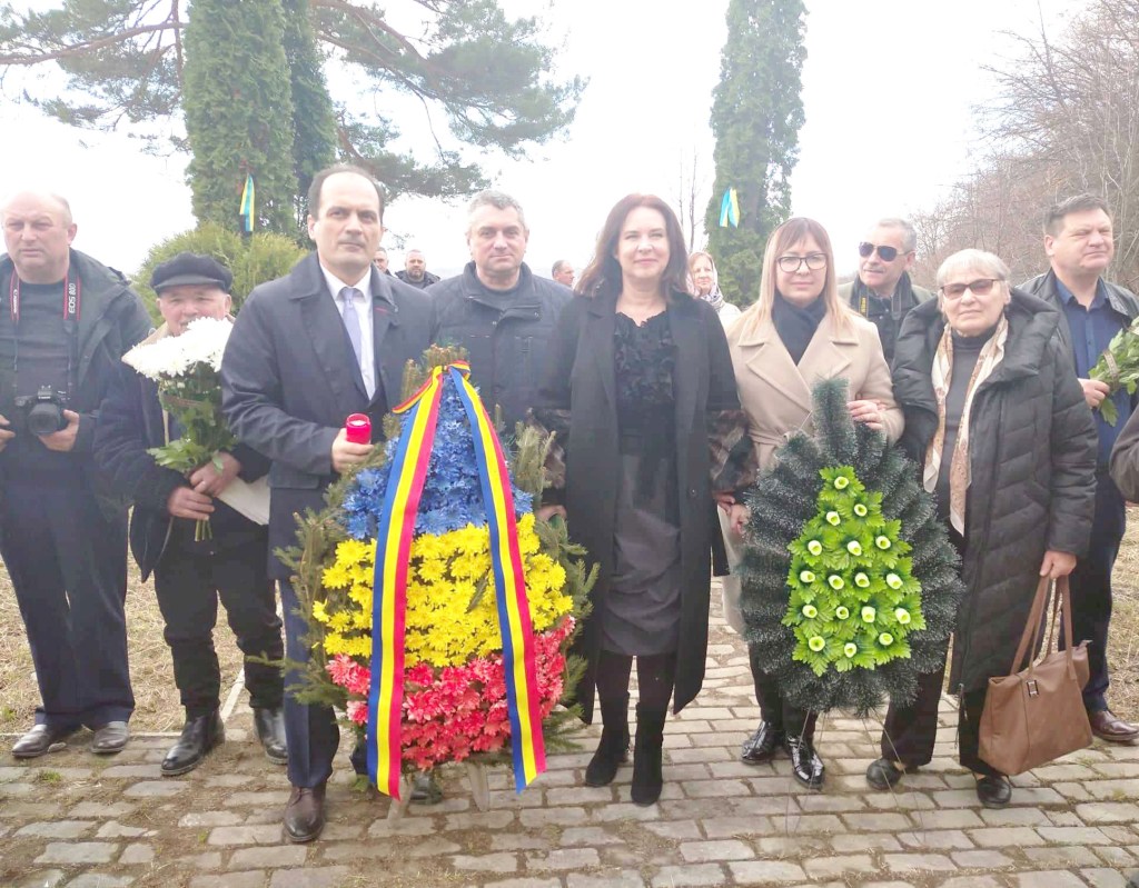 Și cine dacă nu slujitorii altarului, cei care răspândesc printre oameni cuvântul lui Dumnezeu, au avut curaj să ne adune să-i pomenim, să ne cerem iertare de la ei, noi, generațiile care trăim și păcătuim astăzi! Au slujit sfânta liturghie pentru somnul lor liniștit și mântuirea noastră soborul de preoți în frunte cu protopopul de Hliboca, Ioan Gorda și protopopul de Storojineț, Vasile Covalciuc. Cu rugăciuni pentru izbânda dragostei creștine și a binelui, cu rugăciuni pentru pace în Ucraina și între toate popoarele de pe pământ, slujitorii altarelor ne-au unit în jurul credinței și speranței că la mari greutăți lumea se schimbă din rău în mai bine. Și dacă am ajuns să parcurgem și în condițiile de astăzi acest drum, să ne plecăm frunțile și să cântăm în cor cu soborul preoțesc „Veșnica lor pomenire”, o datorăm Consulului General al României la Cernăuți, dnei Irina Loredana Stănculescu. A zis acum, ca și anul trecut, când eram constrânși de restricțiile pandemiei, că nimic nu ne poate opri să aprindem o lumânare, să aducem o floare la mormintele martirilor neamului. Împreună cu funcționarul consular Florin Stan și soția sa, dna Viorica, Excelența sa a depus coroana tricoloră la monumentul înălțat în memoria românilor cu dor de țară și de libertate.