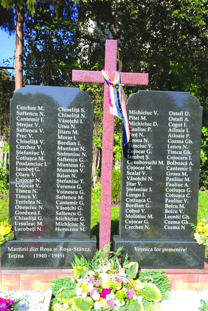 Am scris și am spus de multe ori că înscrişi sau nu pe Cruce, toţi trăiesc în memoria urmaşilor, fiind pomeniţi cu pietate la slujbele preotului, în cântările psalmice ale corului bisericesc. Am simțit cât de viu vibrează în inimile lor durerea amintirilor, stând de vorbă cu oameni mai în vârstă, pe care i-am întâlnit și în anii trecuți. Unii nu mai sunt în viață sau nu-i țin picioarele să vină până la biserică. M-am bucurat să-l întâlnesc pe Nicolae Cozma, care peste câteva zile va împlini 93 de ani. De la vârsta de trei anișori l-au purtat părinții la biserică. Degrabă va rotunji nouă decenii de când pașii îl poartă la sfântul altar. Din cărțile martirajului românesc, i-am dăruit volumul despre DESTINUL BISERICII ROMÂNEȘTI DIN NORDUL BUCOVINEI ÎN PERIOADA SOVIETICĂ. Un crâmpei dramatic din destinul Bisericii de la Roșa am auzit de la Maria Cojocar-Dabula. Un străbunic din partea mamei ei, Mihai Gherman, era pălimar la biserică. Ocupanții ruși au vrut să facă grajd de cai din biserică, iar el a încuiat sfântul lăcaș, a purtat cheia ascunsă în sân, declarând că mai bine moare decât să vadă o asemenea batjocură. Am văzut-o pe urmașa acelui curajos român mulțumită că sunt înscriși pe monument doi unchi de-ai ei – Mihai și Gheorghe, dispăruți în război. Și tatăl ei, născut în 1929 a luptat în Armata Română, dar s-a întors de pe front, având zile până în anul 2000 („pentru că n-a venit cu trenul”, le povestea el copiilor). Maria Prodanciuc se bucură că și-a văzut trei uncheși readuși printre cei înveșniciți în granitul noului monument – trei frați Cozma. Soții Mihai și Domnica Andrieș îl pomenesc pe Iordache Cantemir, fratele mamei lor. Un unchi, un tată, un frate… cât de mult le potolește durerea urmașilor această nobilă lucrare a unor oameni vrednici de toată mulţumirea, enoriași ai sfântului lăcaș, care îi mențin în patria limbii române. Și câtă dreptate au bunicii de la Roşa când le spun nepoţilor că biserica este salvarea lor!