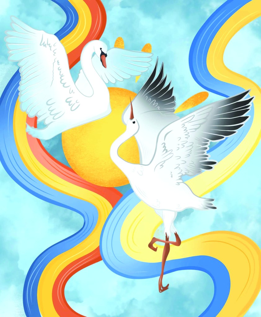 Am făcut câțiva pași împreună pe domneasca stradă pietonală, le-am invitat la Palatul Național al Românilor, reușind, în răstimpul cât am stat împreună, să aflu câte ceva despre familia lor. Părinții Tatianei sunt profesori la Centrul – nord pentru instruire profesională. Acolo își continuă studiile și fiica lor, pregătindu-se pentru facultate. N-a frecventat vreo școală de pictură, dar este pasionată de arta plastică. Cu doi ani în urmă a ilustrat o carte de povestiri FS, în taină de părinți. Nu era încrezută că lucrările ei vor fi acceptate de editor. Numai după ce a apărut cartea, le-a făcut părinților frumoasa surpriză. La Concursul „Mesaj pentru Ucraina” a îndemnat-o să participe tatăl ei, Oleksandr Lebedenko, profesor de istorie. Ideea inițială a fost alta, dar până la urmă Tatiana s-a lăsat „recenzată” de tatăl ei, căutând singură un subiect mai original. Lucrarea cu genericul „Birds of will and freedom” (Păsările speranței și libertății), într-adevăr, are un mesaj profund, oglindind aripile protectoare ale României asupra Ucrainei, întruchipată în cocorul care are nevoie de ajutor. Premianta concursului a ținut seama de condiția principală: a exclude atmosfera de agresiune. Din cele două curcubeie pe cerul comun pentru toate popoarele lumii se revarsă lumină, speranță, bucuria de a trăi și a crea în numele unei vieți libere și fericite. Într-un punct curcubeul tricolor și cel bicolor se unesc și e bine ca generațiile viitoare să se unească în tot ce au mai de preț fiecare, respectând valorile naționale ale fiecărei etnii. Or, când unii se consideră mai presus de alții, atunci se iscă ura, încep războaiele, se ucide „corola de minuni a lumii”, vorba poetului român Lucian Blaga.