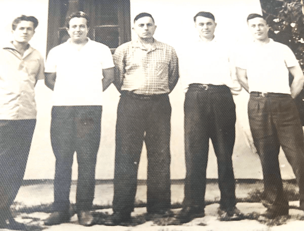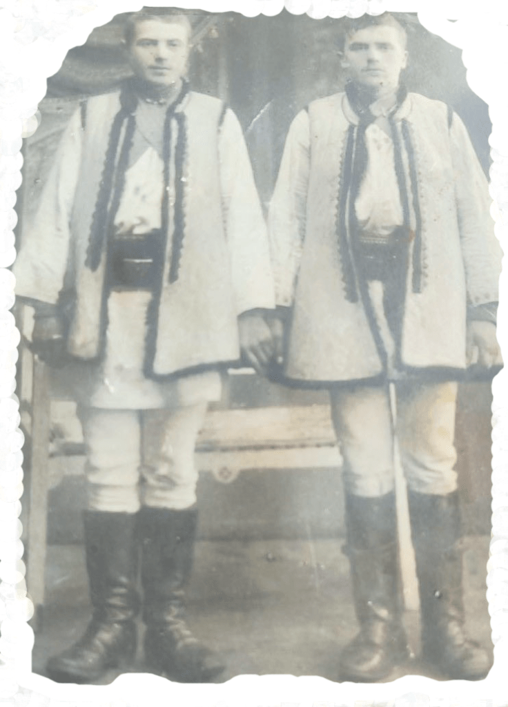 Frații Samoilă, în fața căsuței ridicată de Ionică Samoilă