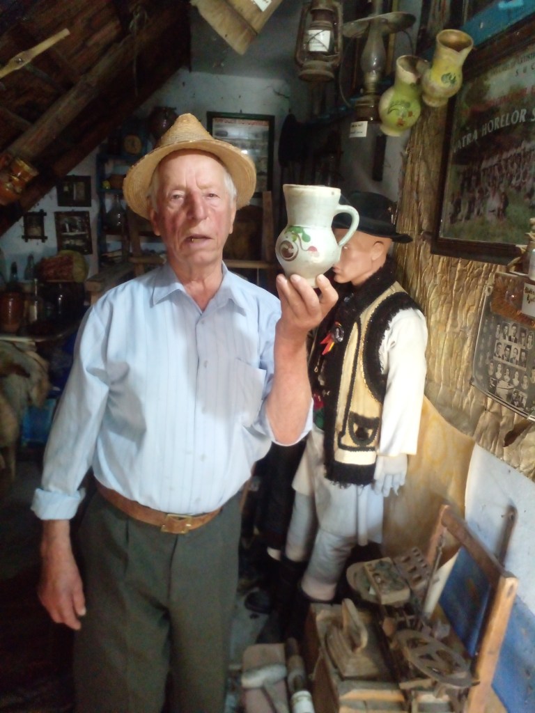 – Sunteți un om bun, ați făcut o faptă bună, îi spun cu blândețe stăpânului. Între timp îmi fug ochii roată: ba la ulcioarele de pe gard, ba la uneltele de muncă atârnate pe pereții bucătărioarei de vară, ba la exponatele din curte și din gang. Or, ele sunt multe, vechi și originale. Căruța de lemn din curte cu doi copilași îmbrăcați național, adică două păpuși frumoase așa, cum pe timpuri, cu sute de ani în urmă, îi luau părinții la muncile câmpului. Descopăr râșniță de lemn și piatră, fier de călcat de odinioară, butelii pentru vin și brânză, covățele, lopățele. Într-un capăt al verandei, un alt băiețel drăgălaș stă la sucală, un element al stativelor de țesut. Dar câte și mai câte văd aici. Iar stăpânul casei între timp îmi tot povestește despre fiecare obiect. Intrăm în șopronul din partea de apus al casei sale vechi, dar atât de bine păstrată. Mă întâmpină în partea stângă a încăperii un soldat echipat exact în hainele soldățești în care a făcut armata dl Ionică. Apoi alte 2 manechine, îmbrăcate în haine naționale.